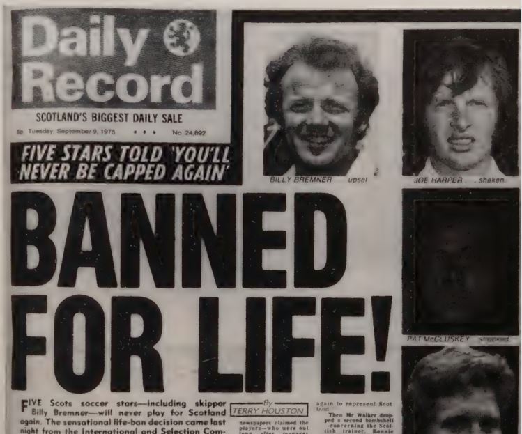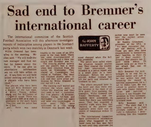 No arrests were made and the players sloped back to the hotel, but they weren't quite ready to try out their Scandinavian duvets, with Bremner instigating the trashing of a room, unaware it was that of SFA blazer Jock McDonald. "Billy was all apologies when Jock re-appeared. Jock hit him with a punch which lifted him clean off his feet. I skedaddled into the next room. Tom Hart and Tommy Younger from Hibs were there. 'Like a drink, Willie?' they asked. 'Okay, just a wee one,' I said. 'It's been an eventful night already.'"